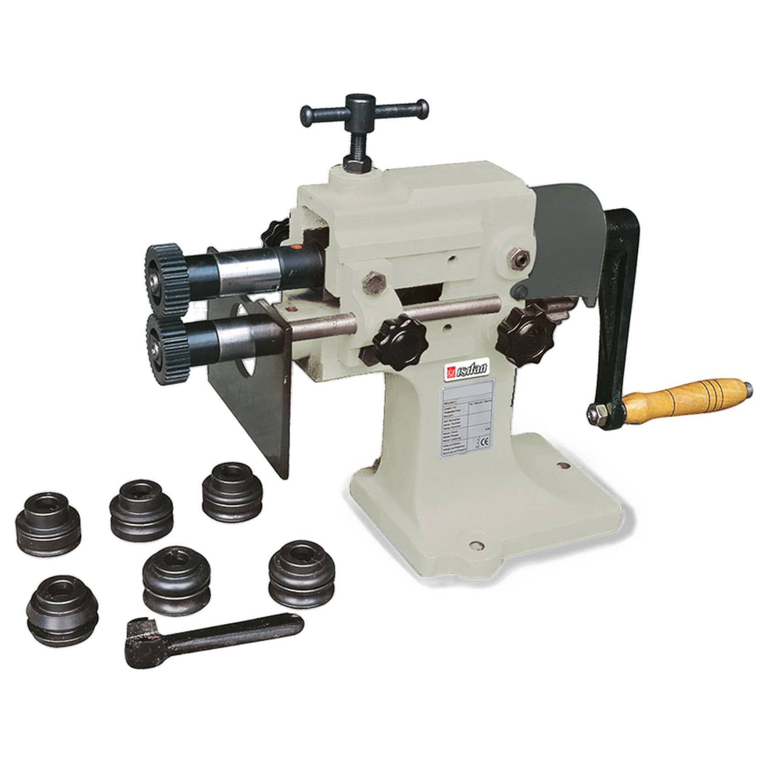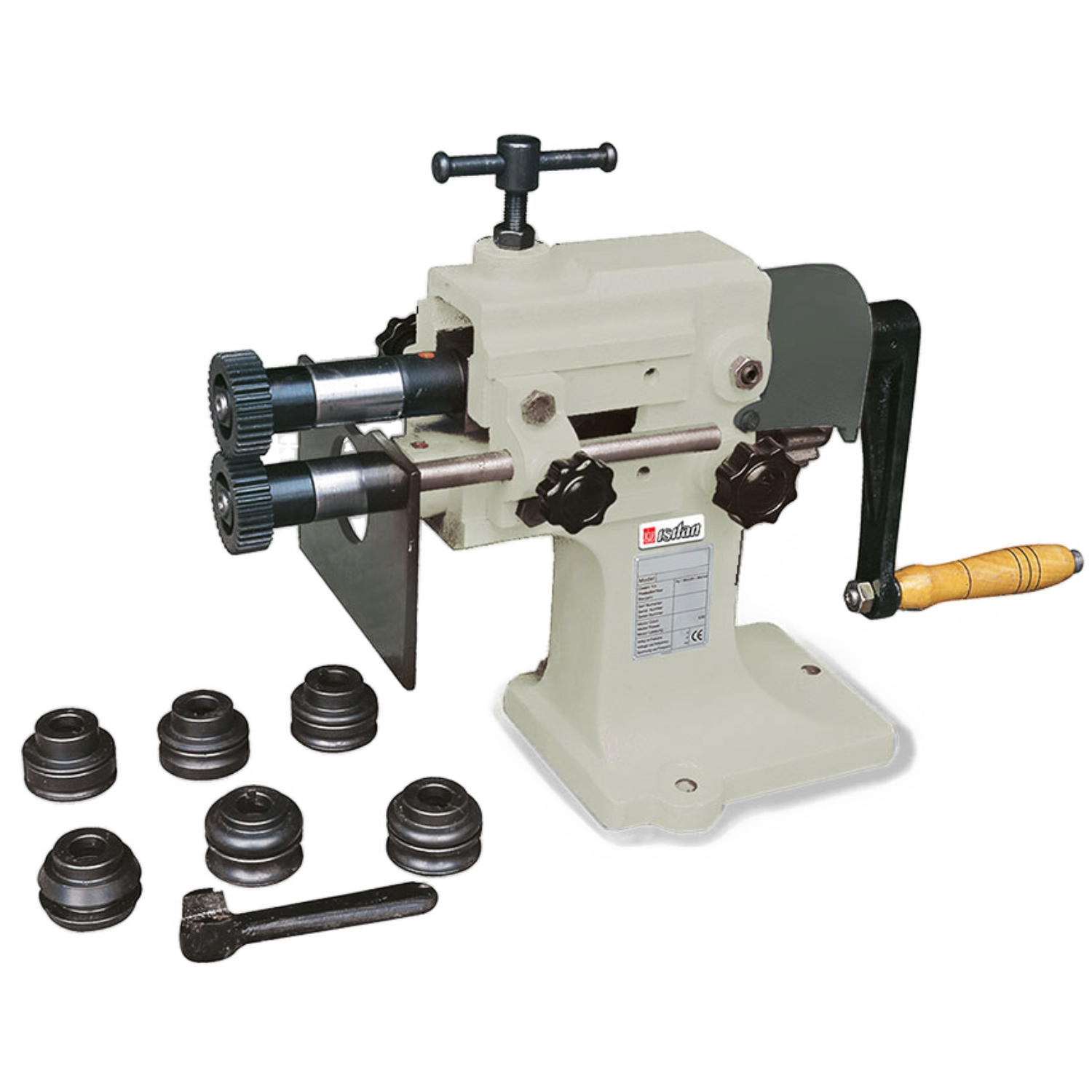 ISITAN HAND SWAGERS / SWAGING MACHINES (HS80I) are principally used for swaging, beading, wiring, crimping and forming of sheet metal. This hand swager has a 80mm throat and can accommodate mild steel sheet up to 0.8mm thick. This machine comes complete with 7 sets of rolls and a roll spanner key.