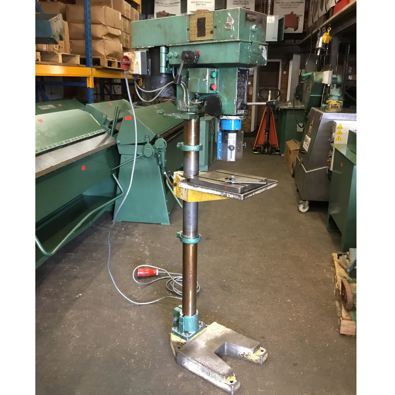 MEDDINGS PILLAR DRILL (MPD01) has a 180mm throat and can accommodate mild steel up to 23mm thick. This machine has 5 speeds and a supply voltage of 415v, 3 phase electrics.