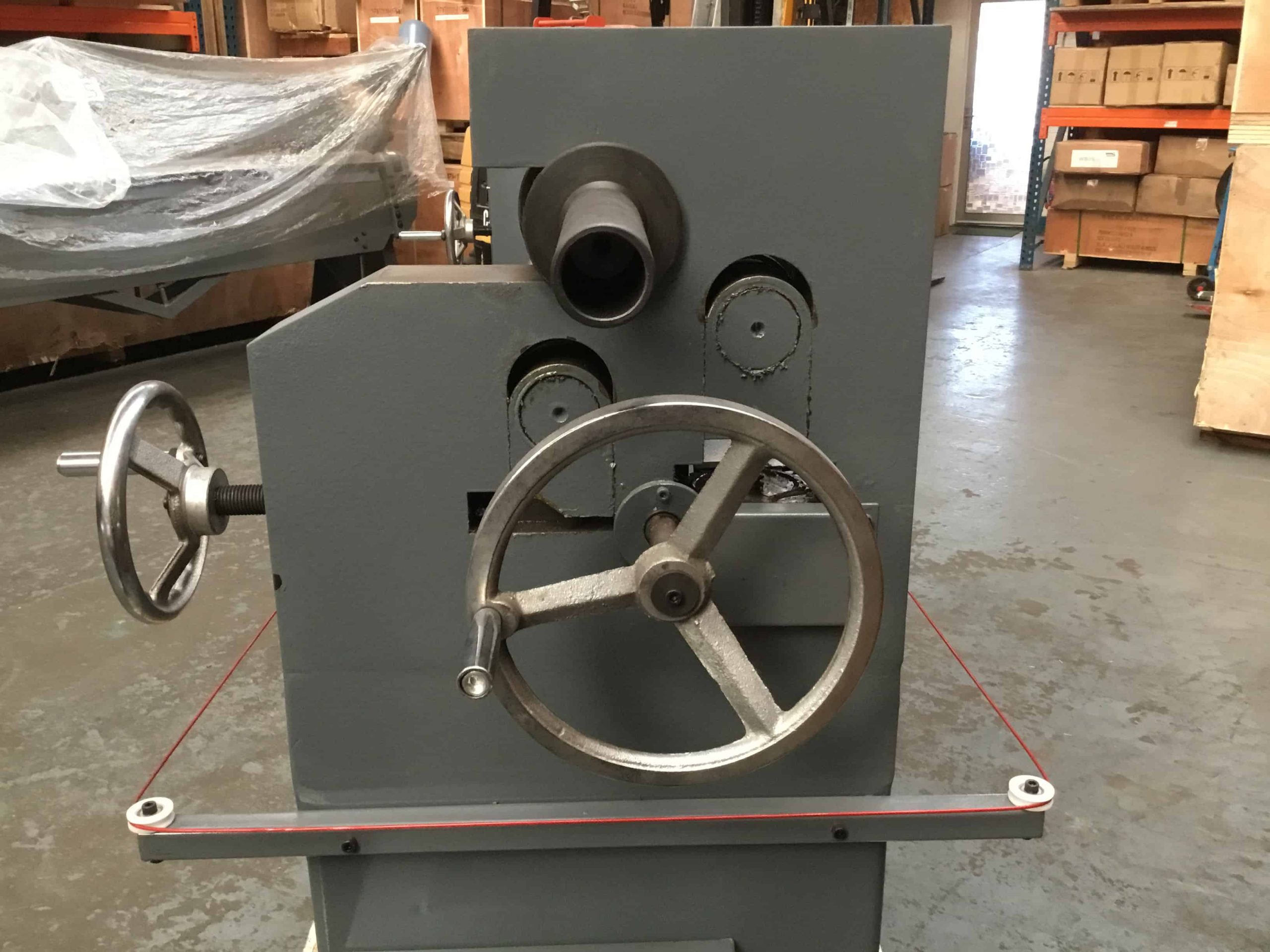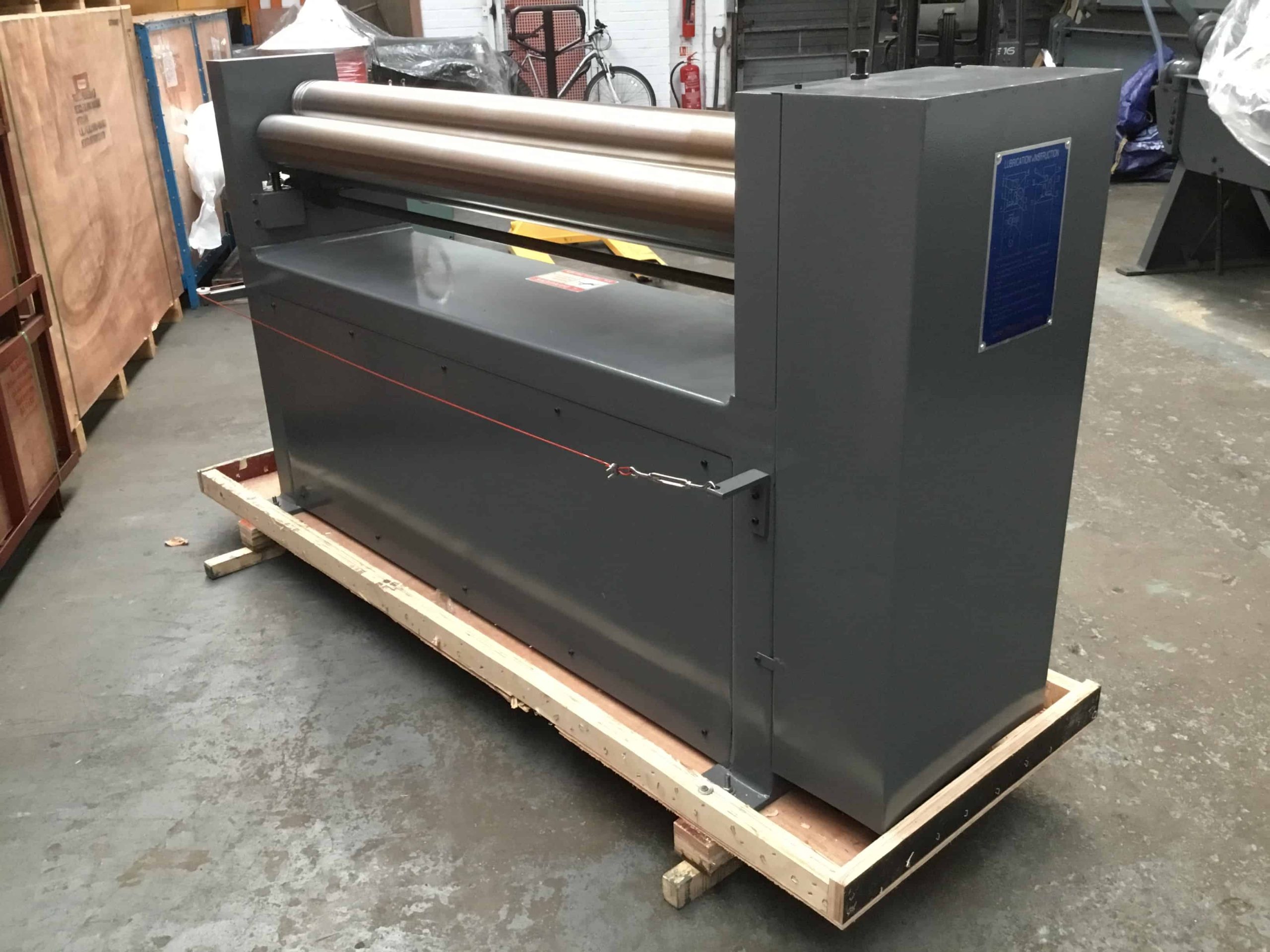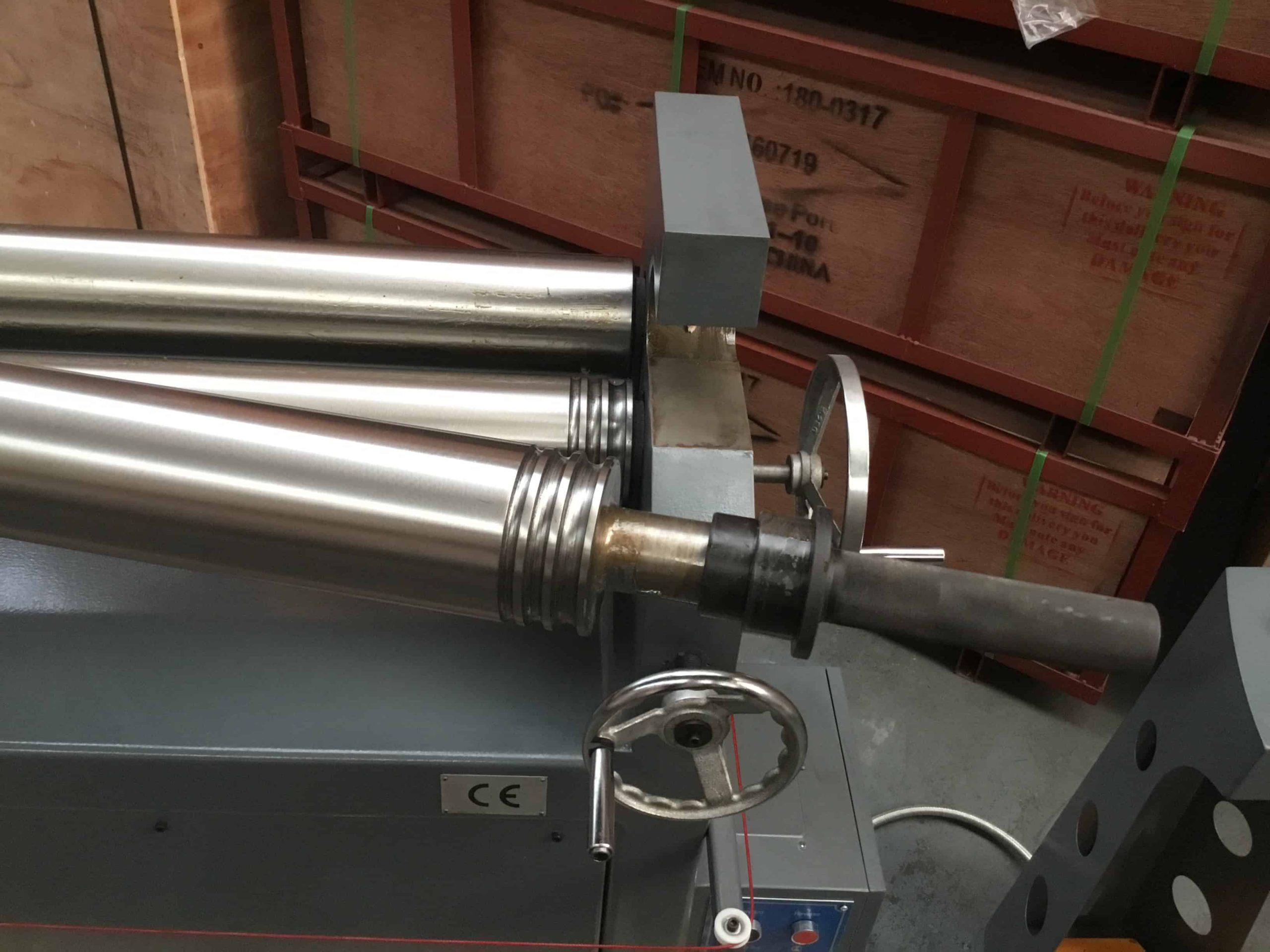 WNS POWER BENDING ROLLS (PBR1535/120J) are principally used for rolling tubes/cylinders in sheet metal. The metal is ‘pinched’ between two rolls and curves as it comes into contact with the third (back) forming roll. The PBR1535/120J has a 1535mm roll length, 120mm roll diameter and can accommodate mild steel up to 3.5mm thick. The rolls are top slip and equipped with 3 x wiring grooves.